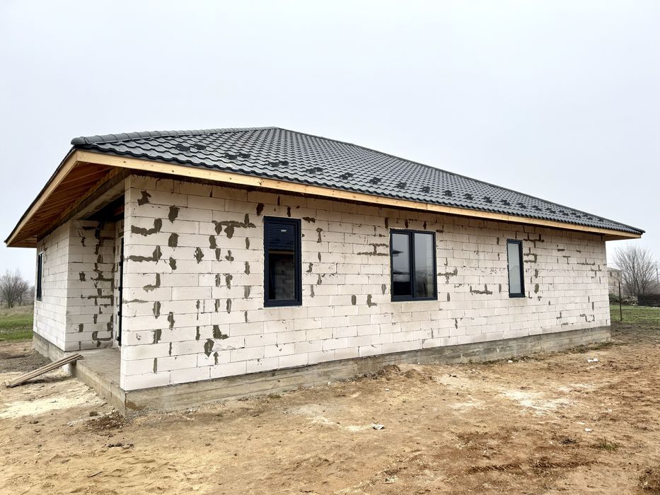 • Фундамент і стіни: стрічковий фундамент глибиною 90 см, який звʼязаний з загальною бетонною плитою, все армовано, стіни зроблено з газоблоку товщиною 32 см із додатковим армуванням(арматура діаметр 10 см) кожен пʼятий ряд і армопоясом по всьому периметру;