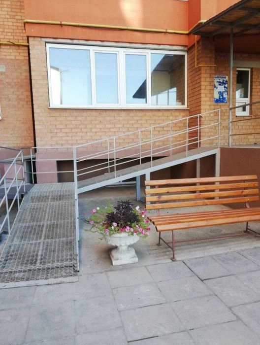Вхід і вікна виходять у внутрішній, замкнений і тихий двір (дворик у формі літери «П»). Є зручний пандус із поручнями, домофон, вільні паркомісця. Розташування також підходить для переобладнання квартири під офіс або малий бізнес.