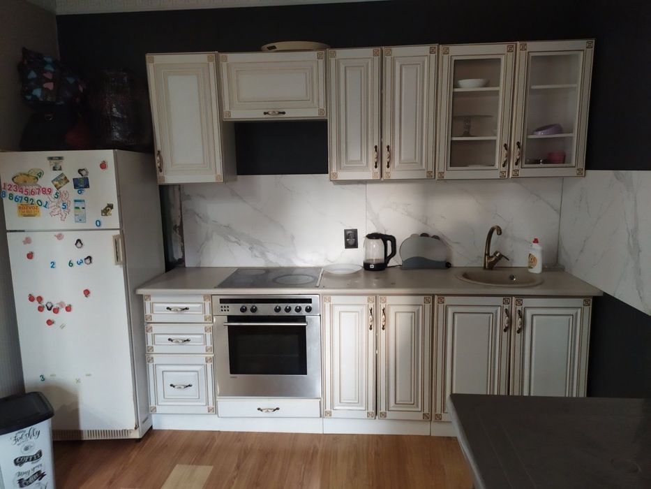 Кухня обладнана кухонним гарнітуром, плитою, духовкою, холодильником та розкладним диваном.