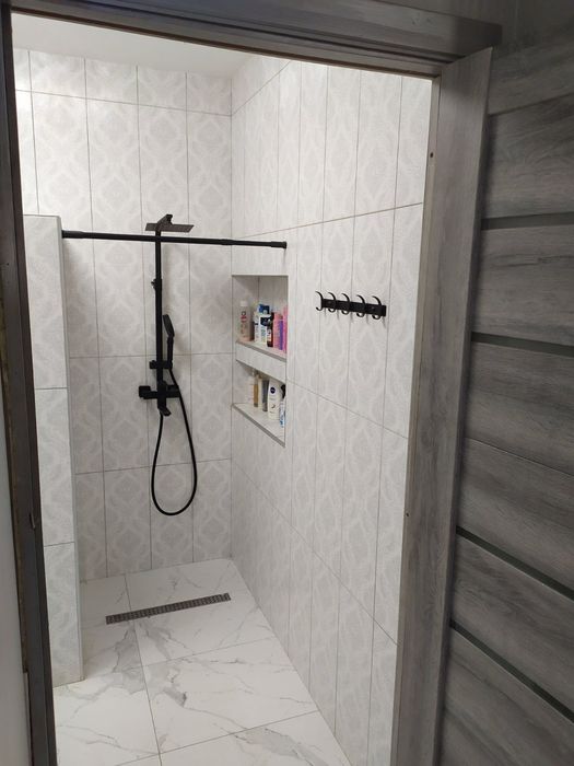 Санвузол включає просторий душ, туалет та умивальник.