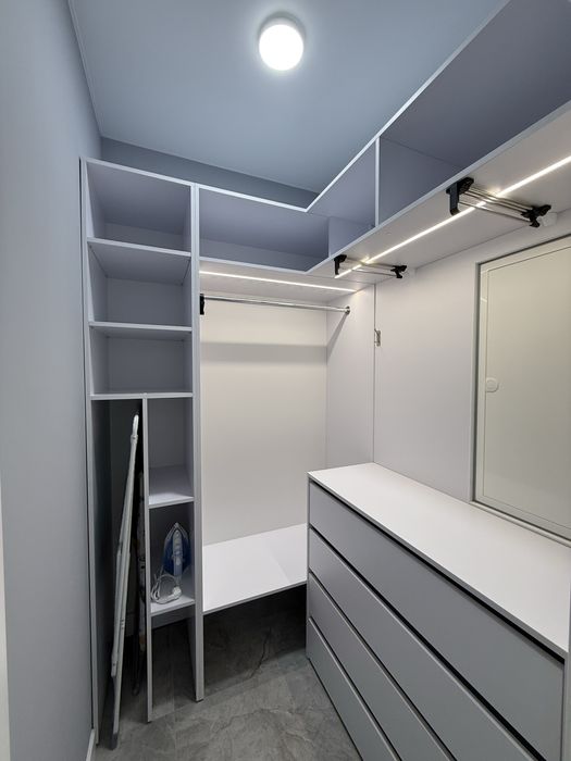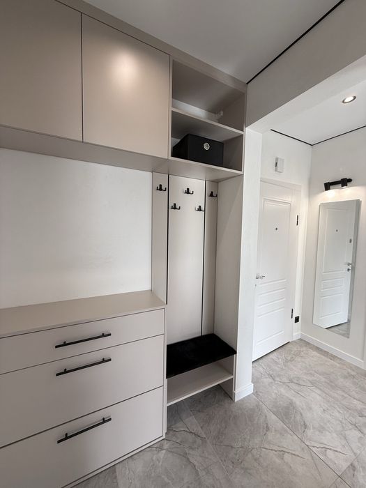 Повністю з меблями. З побутової техніки - пральна машина разом із сушкою, посудомийна машина, 2 кондиціонери, мікрохвильова, праска, газова плита, духовка, електрочайник. Вся побутова техніка, меблі, матрац - нові. Посуд також новий. Газовий котел. Ліжко з нішою для зберігання у спальні 180х200 см. На кухні розкладний диван на 120 см в ширину. 2 пари вхідних дверей. Гардеробна кімната. У всіх кімнатах продумано багато місця для зберігання речей. Тепла підлога на кухні, коридорі, гардеробі та ванні.