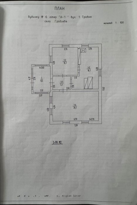 Загальна площа будинку - 74.9 кв.м, житлова - 44.2 кв.м. Складається з 3-х кімнат, коридора та веранди.