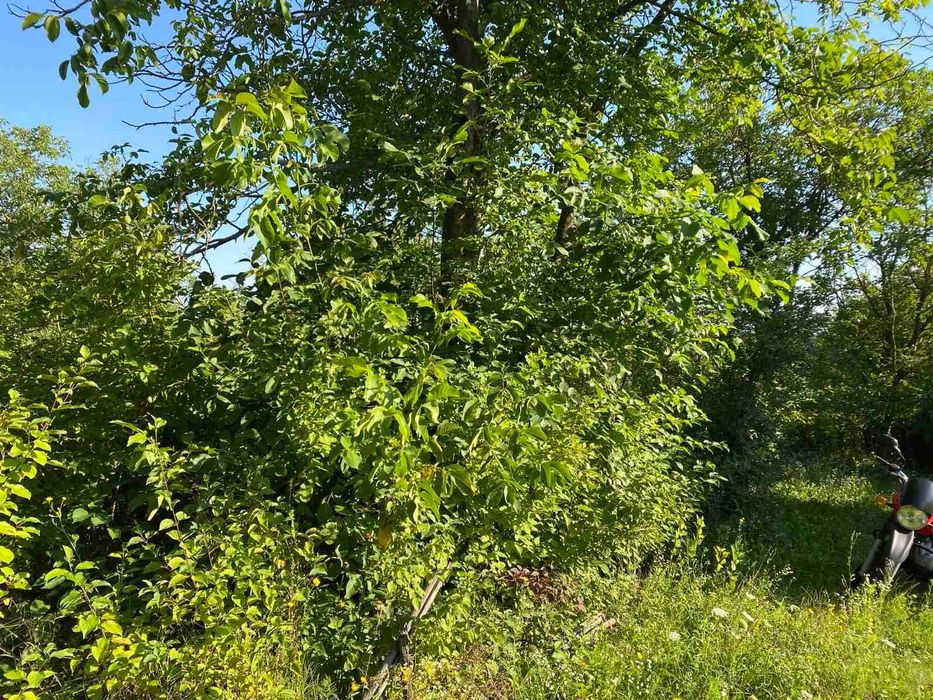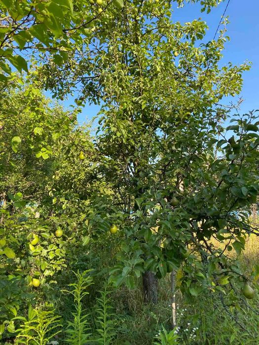 Є три великих горіха, груша та яблоні.