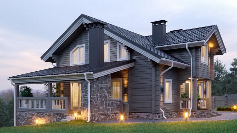 Є повноцінний архітектурний проєкт будинку з ландшафтним дизайном, який органічно вписується в рельєф і відкриває краєвиди на озера та ліс.