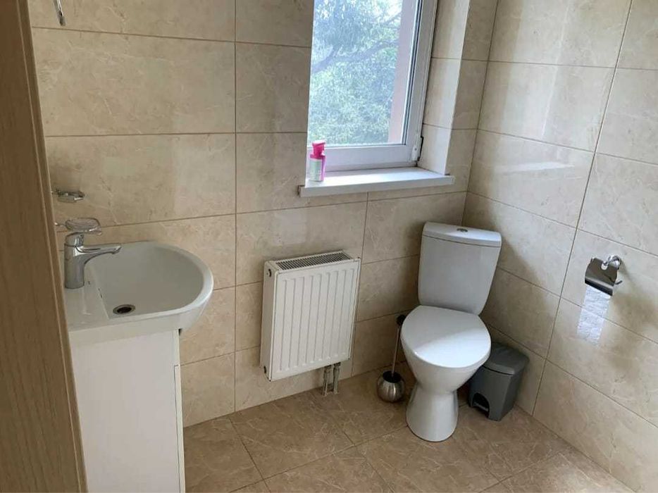 Санвузол першого поверху має умивальник с дзеркалом, унітаз і пральну машину.