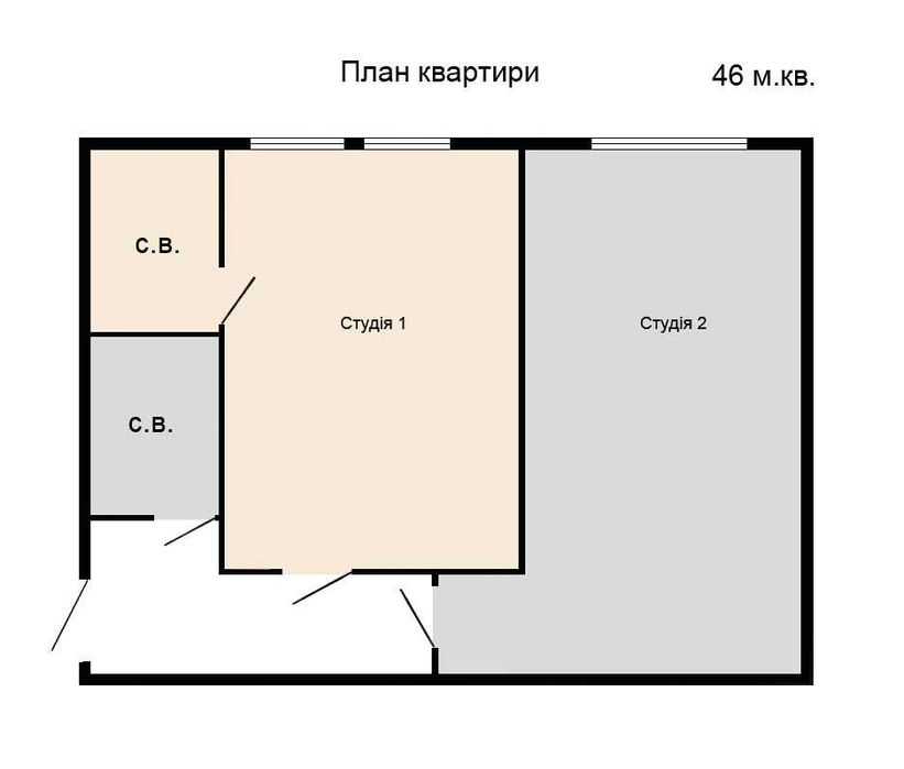 Квартира знаходиться в не глибокому цоколі, розділена на дві студії (18 і 25 м.кв.) котрі здаються окремо.