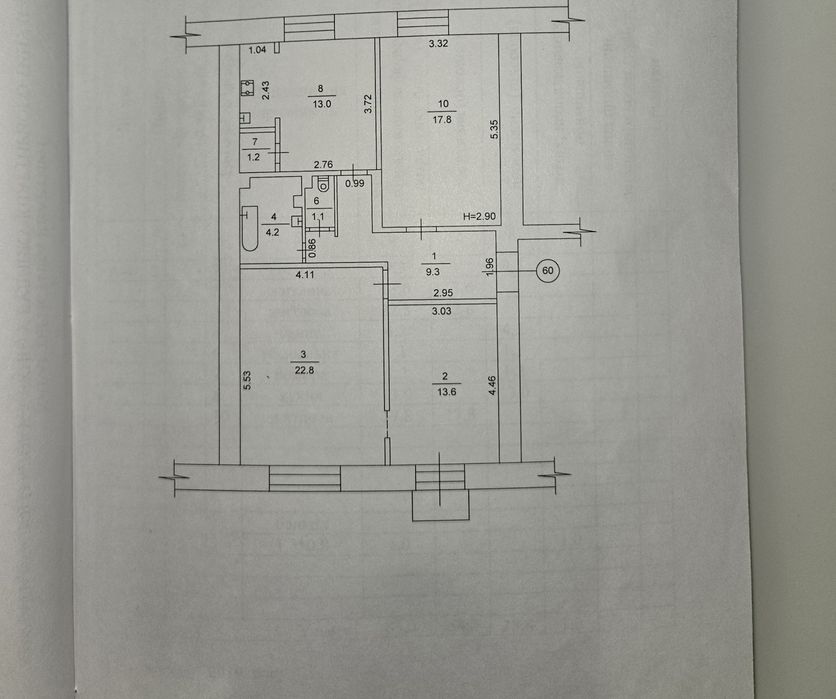Кухня 14 кв.м; ванна кімната 5,3 кв.м, 1) кімната 13,6 кв.м; 2) 22,8 кв.м; 3) 17,8 кв.м. Коридор 9,3 кв.м; Висота стелі 3.2м. Планування можно зробити, за вашим бажанням.