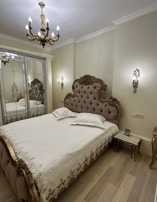 2 спальни, гостиная, кухня, гардеробная, 2 санузла, лоджия. Полы -травертин, паркет, подогрев полов.