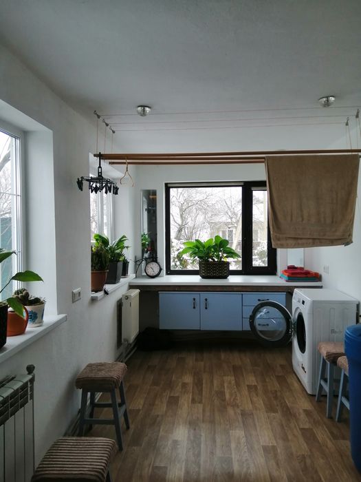Економне газове опалення з італійським котлом + регулювання температури окремо в кожній кімнаті. В будинку є справна груба на дровах. Кондиціонер не ставили, не було такої необхідності, оскільки утеплення по горищу 250 мм мінвата + зелене затінення будинку. На кухні техніка, варочна панель газ+індукція, ванна в керамограніті з водяною теплою підлогою. Три зливні ями: на санвузол, на постірочну та в літній кухні.