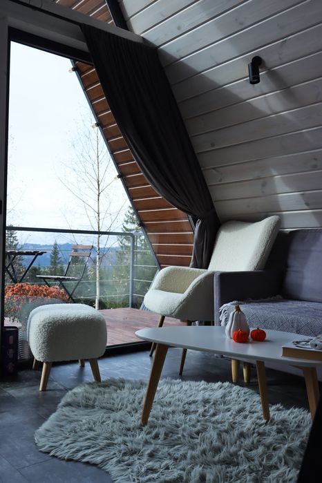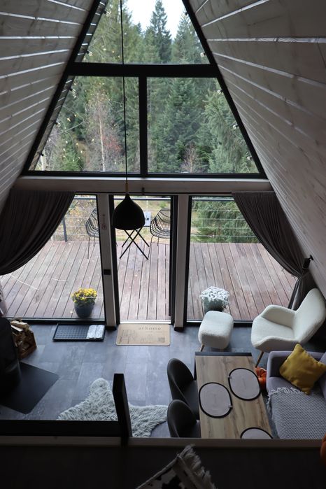 Відпочинок в Карпатах. Оренда житла. Будиночки в горах; Forest Hust Yablunytsya-це два будинки A-frame в сучасному стилі з великою панорамою, де відкриваються прекрасні краєвиди гір, які розташовані у тихій місцині Яблуниці.