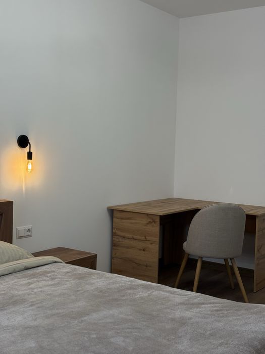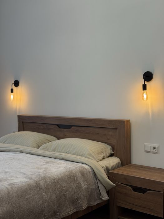 У спальній кімнаті є велике комфортне ліжко з приліжковими тумбами та робочий стіл із мʼяким кріслом.