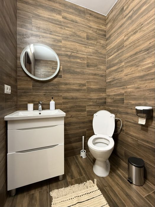 Санвузол - поєднання естетики, комфорту і сучасності. Модна душова, дорога сантехніка, дзеркало з підсвіткою, умивальник з тумбою - все це підкреслює бездоганний зовнішній вигляд інтерʼєру.
