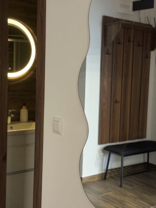 Прихожа з деревʼяними панелями, бенкеткою, вішалкою для одягу та великим дзеркалом - все це гармонійно поєднується та додає комфорту для Ваших гостей.