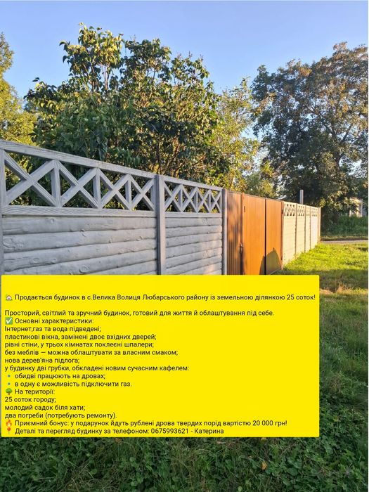 Продається будинок у селі Велика Волиця,Любарського р-ну.; За детальною інформацією і додатковими фото ,звертайтесь за телефоном 06******21 - Катерина