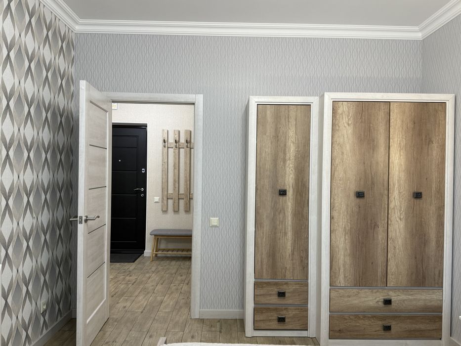 Розташована на 21/22 поверхового будинка. Загальна площа 50 кв.м., кухня 18 кв.м спальня 15кв.м гардеробна 4,5кв.м