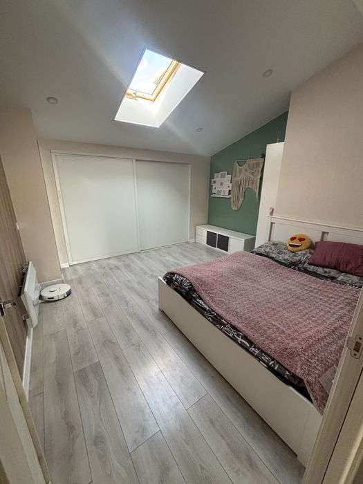 Светлая комната с большой кроватью, мягкой стеной-акцентом, большим шкафом-купе и мансардным окном. Отличное место для отдыха.