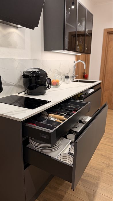 • Кухня: розташована в широкому проході між двома зонами. Вона не є окремою кімнатою, виконана за сучасними вимогами, з компактно підібраними девайсами, що перетворює приготування їжі на легке задоволення та не краде простір.