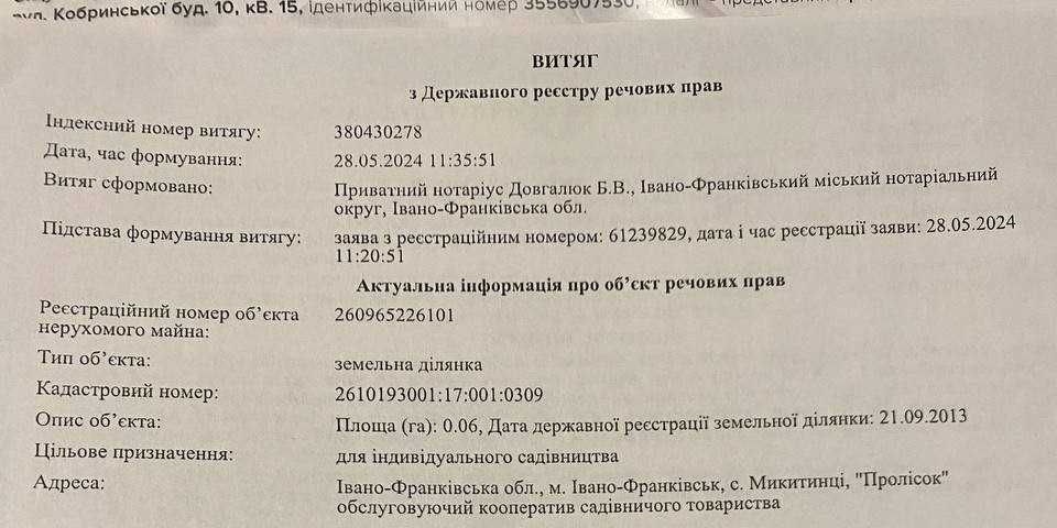 Земельна ділянка в Микитинцях (Івано-Франківськ); Продається земельна ділянка в селі Микитинці садівниче товариство "Пролісок". Ділянка правильної форми, розмірами 15х40 метрів, площа - 6 соток. Цільове призначення - для індивідуального садівництва. На ділянці розташована господарська будівля, насаджено багато фруктових дерев та кущів. Ділянка розташована в тихому затишному місці в 10-ти хвилинах їзди від Івано-Франківська, масив з усіх сторін оточений лісом, від ділянки до лісу 100 метрів. На сусідніх вулицях проживають люди на постійній основі. На дану територію розроблено ескізний проект. Ділянка чудово підійде як для власного проживання, відпочинку так і для дохідної нерухомості. Реальному покупцю хороший торг.