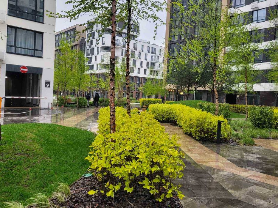 Ландшафтний благоустрій поблизу: березовий міні-парк з гамаками, альтанки між молодими соснами, шезлонги під сакурами, неонова підсвітка дерев та автоматизоване ЛЕД-освітлення пішохідних доріжок з дизайнерським мощенням.