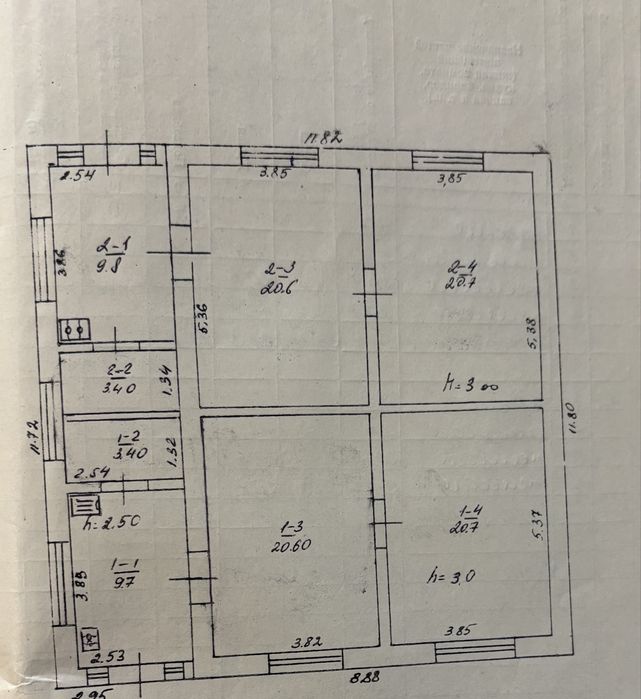 2 половина: 2 кімнати, кухня, сумісний санвузол.