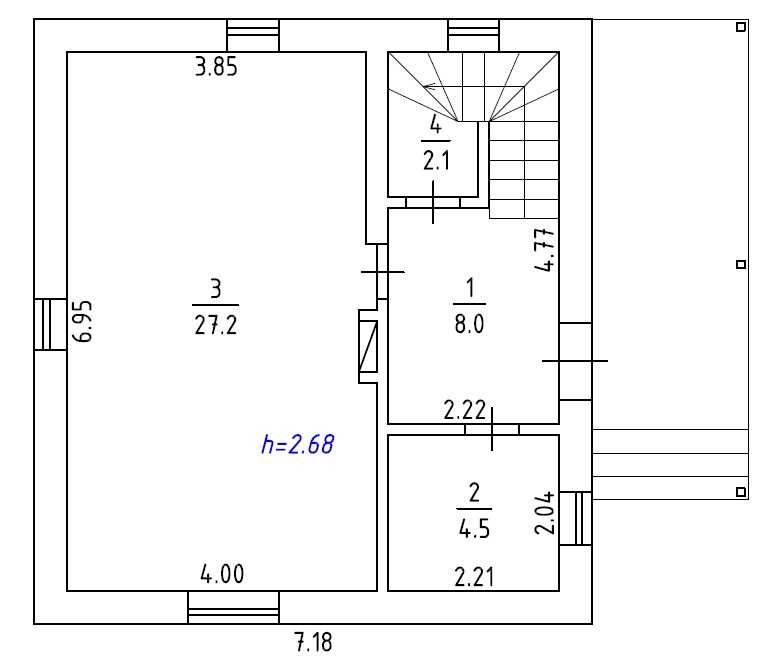 1 поверх: велика вітальня студія-кухня, санвузол, кладова під сходами;
