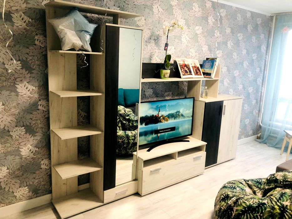 Бытовая техника ( холодильник, стиральная машина, микроволновая печь, варочная поверхность) + новая мебель ( большой удобный раскладной диван с нишами для хранения, кухонная мебель с пленочными фасадами, раскладной стол, гостиная, прихожая) + предметы интерьера.