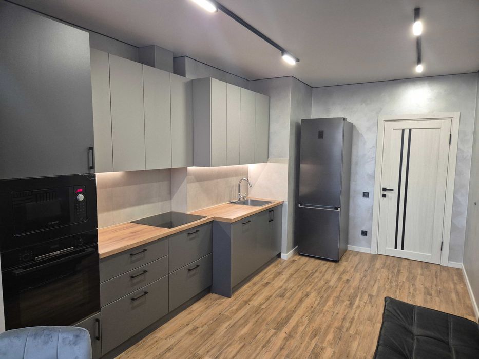 Вся вбудована техніка (духова шафа, варильна поверхня, мікрохвильова піч, посудомийка) фірми Bosh, холодильник та пральна машина Samsung. Кухня з відпочинковою зоною, де легко поєднати роботу, прийом гостей та релакс.