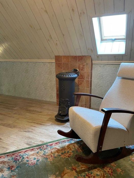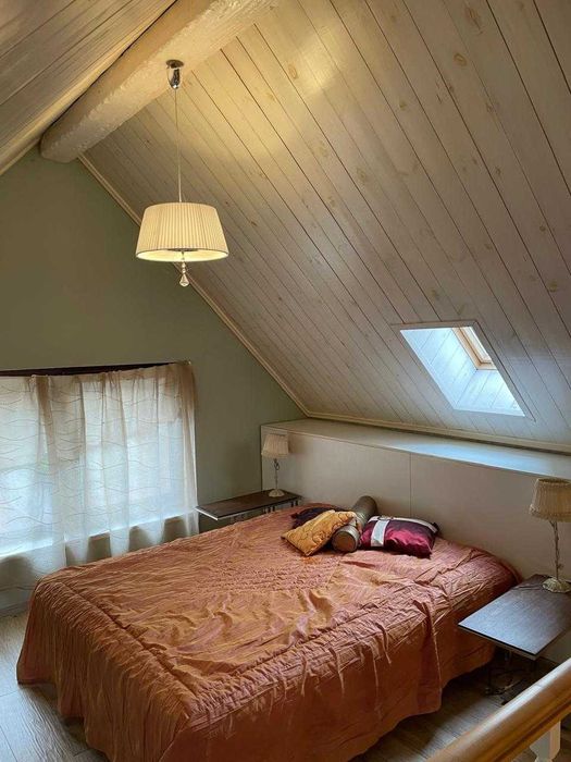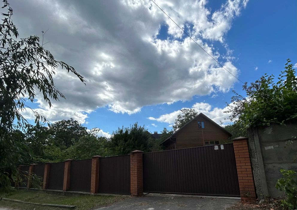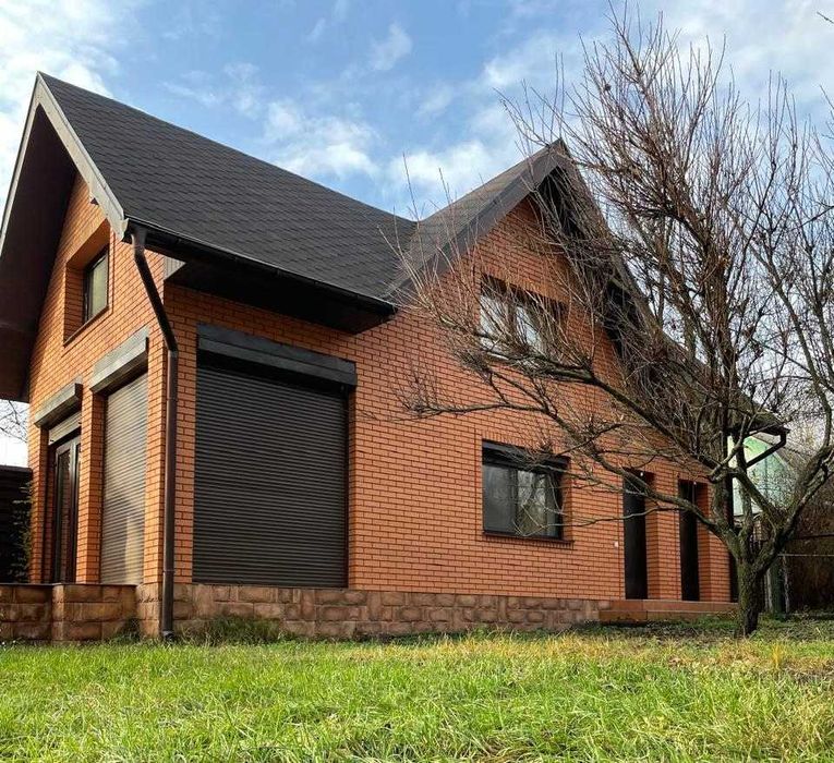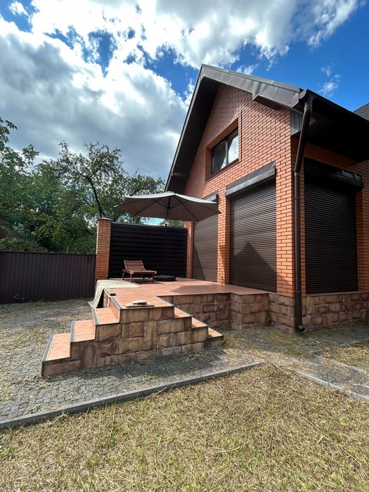 Сучасний котедж в міський смузі, Водогін (ДВС), Р69; Сучасний якісний котедж 100 м2 в міський смузі, виконаний в стилі французького шале, авторський дизайн-проект (італійська плітка та декоративна цегла, венеціанська штукатурка, шпалери Laura Ashley, італійські меблі). Стіни цегла та декоративна цегла, монолітно-каркасна будівля, панорамні вікна в їдальні з виходом на терасу. Опалення тепловий насос, є газовий проект, водопостачання Київводоканал, септік, деревʼяний гостьовий будинок на 2 кімнати. Надзвичайно зручна доступність, окремий вʼїзд, навколо ліс, але вся міська інфраструктура поруч (супермаркет, школа, садочки, амбулаторія). Розташований в СТ Лісова поляна-2, заїзд з вул. Дніпроводської, Водогін (ДВС), Київ чи з траси Р69. Окремий заїзд та паркувальний майданчик для авто. В гостьовому будинку є погріб, приміщення для зберігання садового інвентаря.