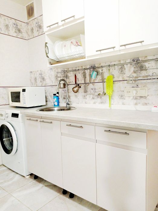 -Есть бойлер, кондиционер,стиральная машина автомат,телевизор смарт,холодильник,пылесос,микроволновка,посуда,постельное белье.