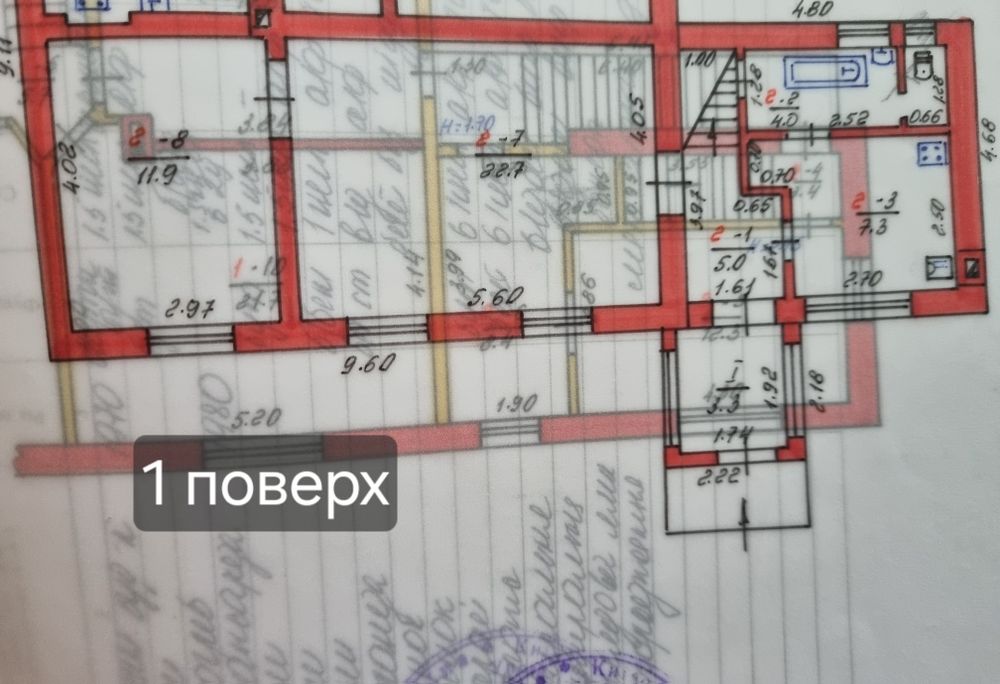 Перший поверх: велика вітальня 22 к.м., кухня 7.3 кв.м, сумісний санвузол 4 кв.м, кімната 12 кв.м.