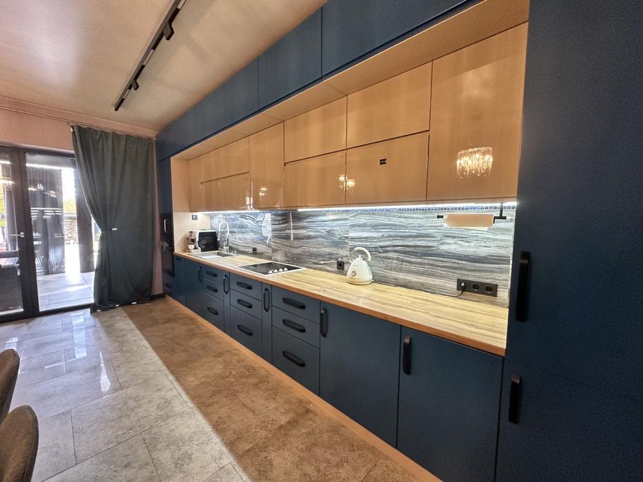 Кухня обладнана електроплитою, духовою шафою, мікрохвильокою, холодильником, посудомийною машинкою-все вбудовано в меблі;