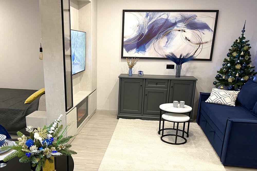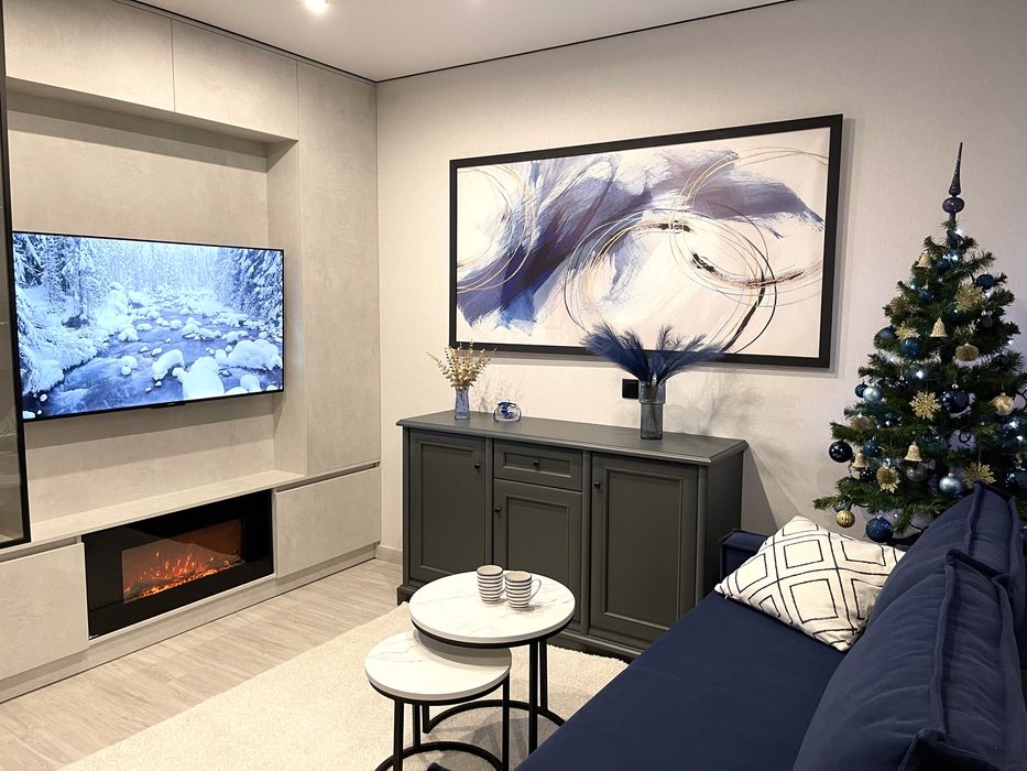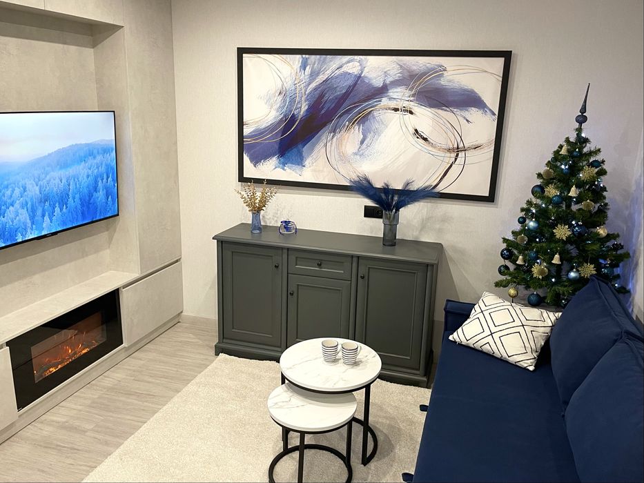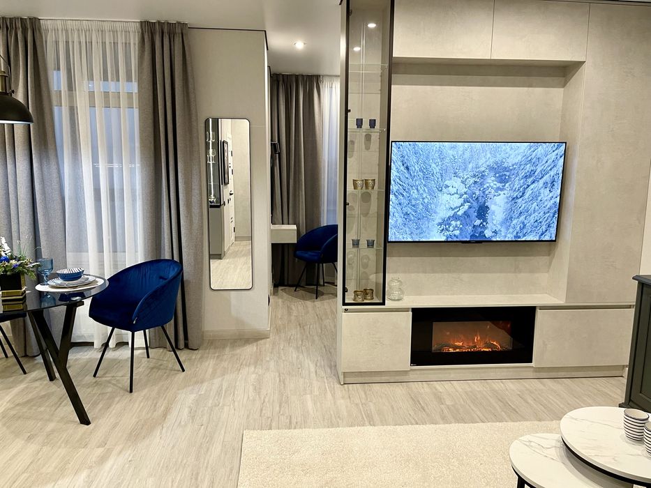 Зона вітальні з дуже зручним розкладним диваном, телевізором і каміном, що додає затишку і атмосферності цьому помешканню.