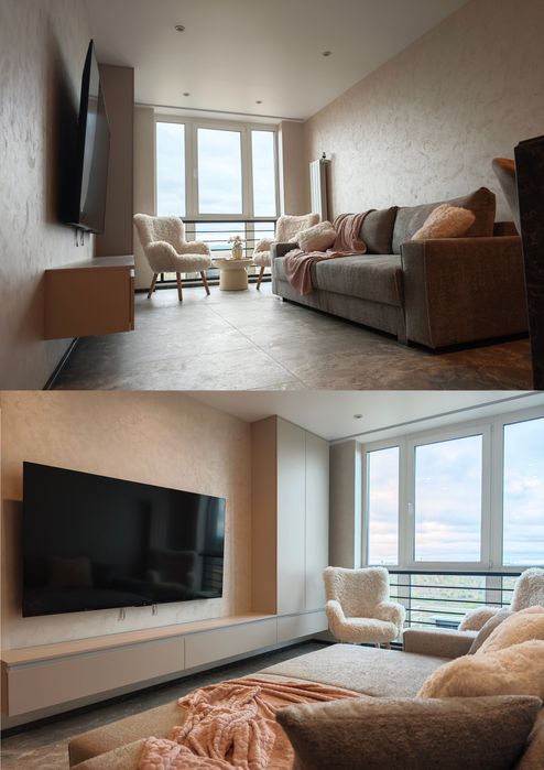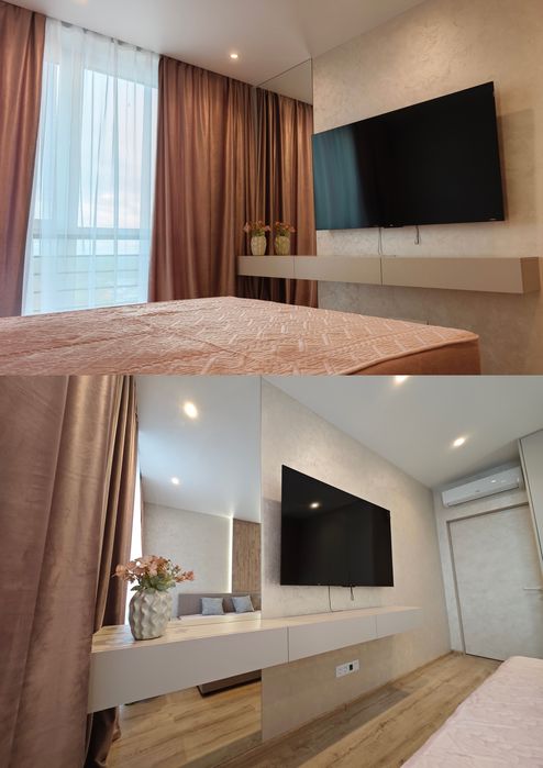 Ліжко 180×200, панно з підсвічуванням, шафа, телевізор 65”, будуарний куточок із дзеркалом у підлогу.