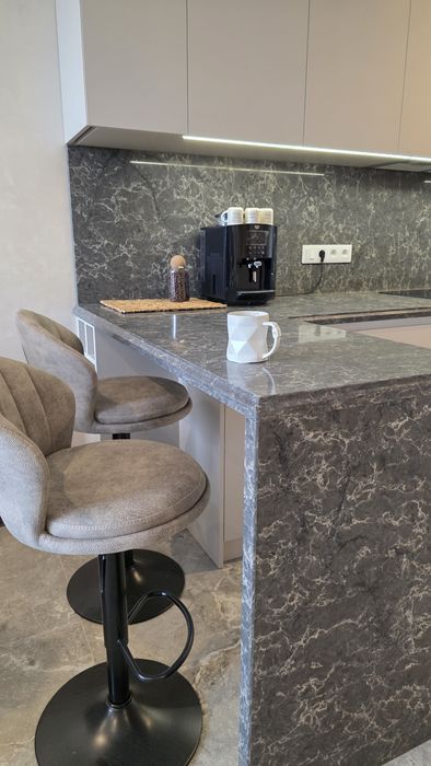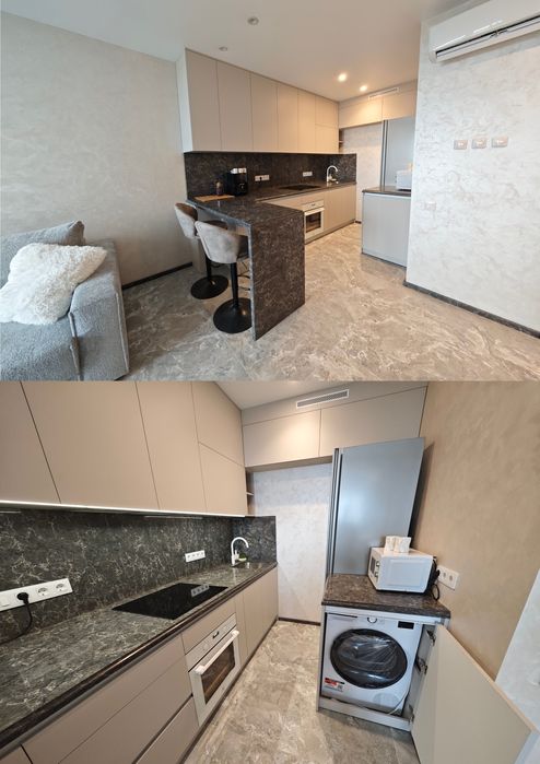Кам’яна стільниця, барна зона, вбудована техніка преміум-класу (холодильник, посудомийна, духова шафа, кавомашина, сушильна машина, індукційна плита, мікрохвильовка).