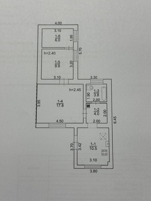 Загальна площа будинку 52 кв.м : кухня 10.5; 3 кімнати 17.8; 9.9; 6.0, коридор 4.0, ванна 3.8 .