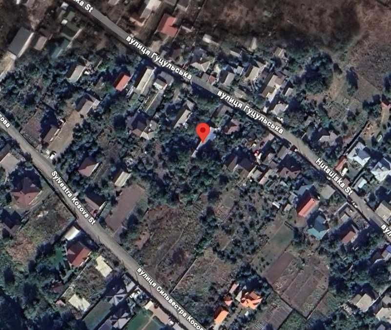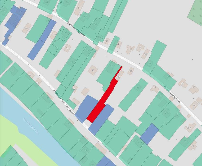 Ділянка вузька та довга, межує з вул. Гуцульська та вул. Сильвестра Косова. Це дозволяє організувати окремі входи та спрощує поділ ділянки.