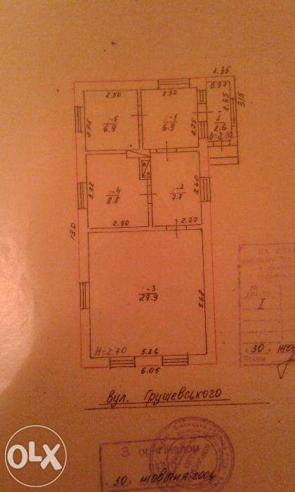 Дах перекритий шифером. У будинку – 3 кімнати, кухня, коридор. Кімнати: вітальня – 29,9 м2, спальня – 8,8 м2, спальня – 6,9 м2, кухня – 7,7 м2, передпокій – 2,6 м2.