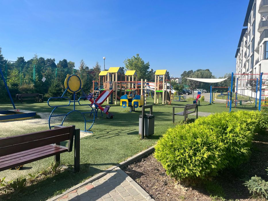 • Сучасний дитячий майданчик та ставок на території