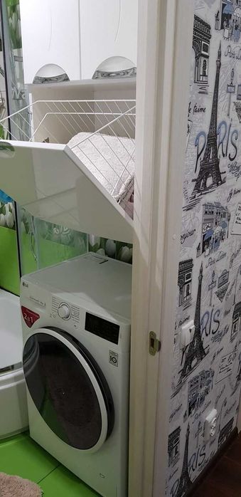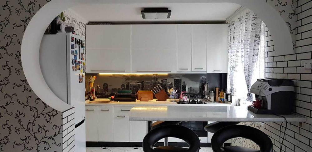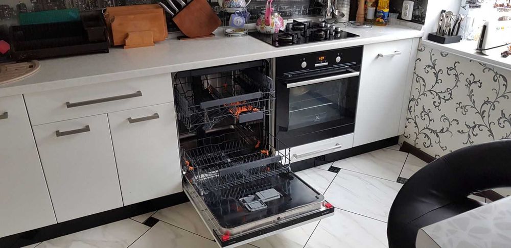 Вбудована техніка: газова плита, духовка, витяжка, посудомийна машина, холодильник, пральна машина.