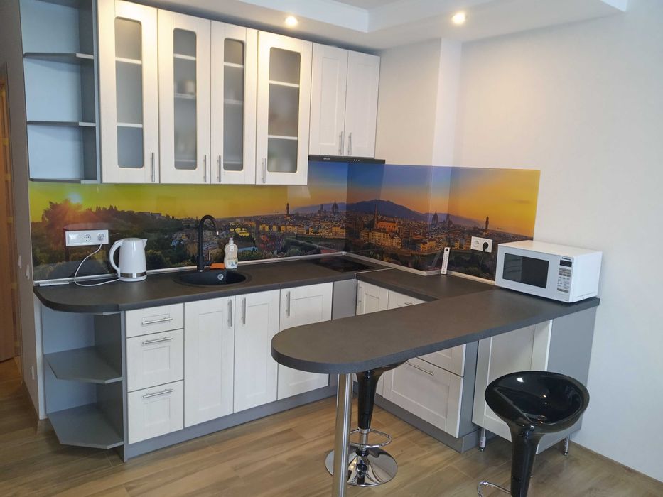 Кухня обладнана кухонними меблями та технікою(холодильник, варочна поверхня, мікрохвильова піч, електричний чайник).