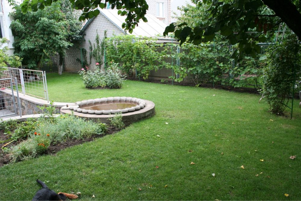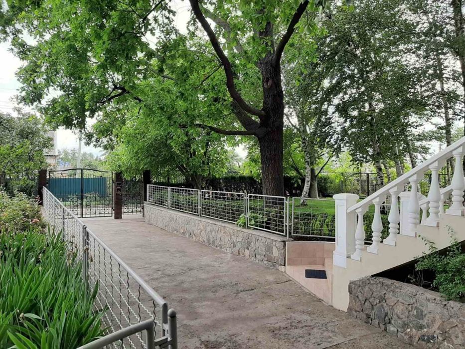 - Закрита територія з кованими воротами, зелений двір з дорослими деревами, газоном та