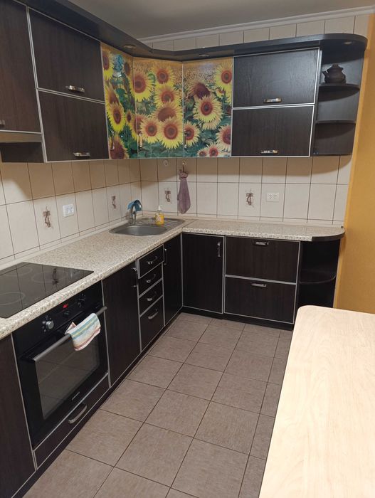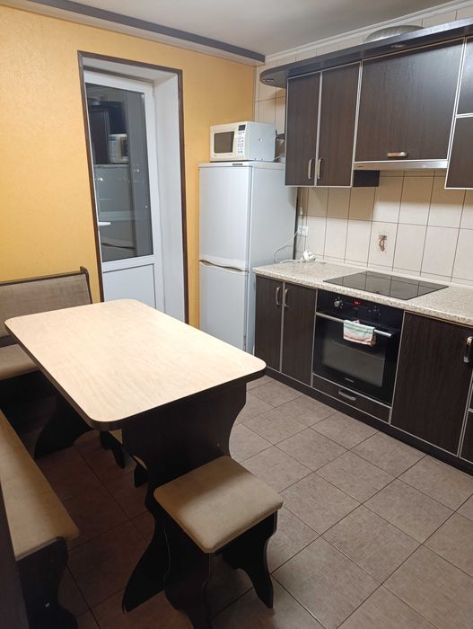 Кухня велика 12 м кВ., повністю облаштована для життя. Кухонні меблі, холодильник, електрична індукційна варочна панель, витяжна шафа, електродуховка, мікрохвильовка. З кухні є вихід на лоджию.