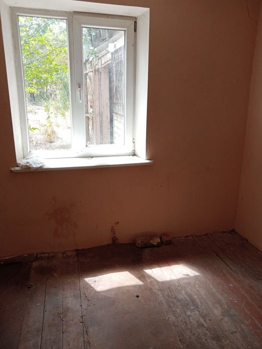 Снаружи давно не белили и не красили. Окна деревянные. В одной комнате пластиковое.