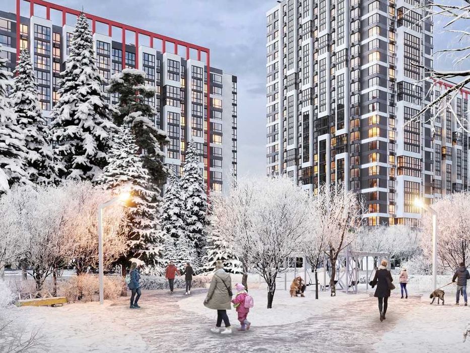 зовнішній фасад з першого по третій поверхи — керамограніт, 4 і вище — фасадна штукатурка або декоративна штукатурка (мокрий фасад), утеплення мінеральною плитою