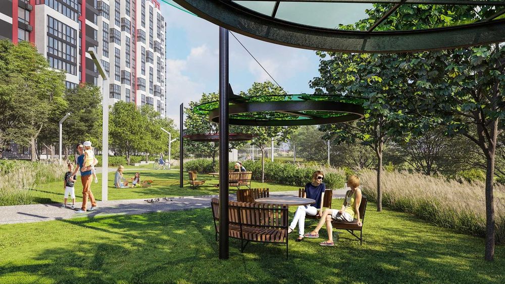 проєкт благоустрою території включає в себе озеленення, пішохідні доріжки, облаштування малими архітектурними формами, майданчиками