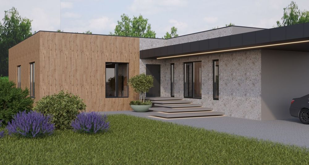 Фасад комбінований: плитка великого формату і мармурова крихта.