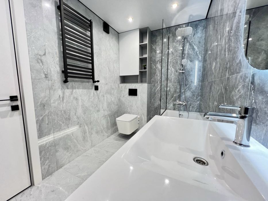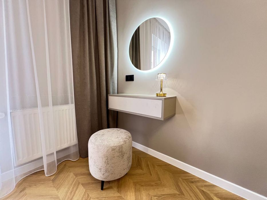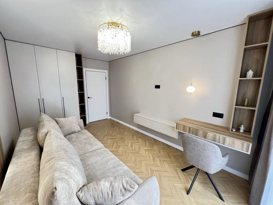 Дві окремі кімнати, простора кухня з виходом на балкон, відпочинкова зона з диваном та телевізором, гардеробна кімната та великий санвузол.