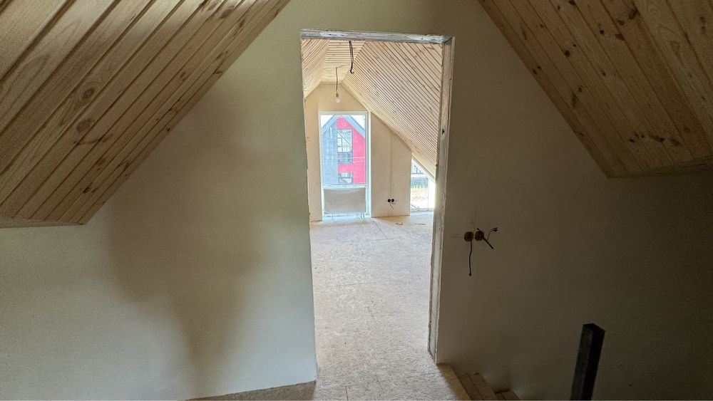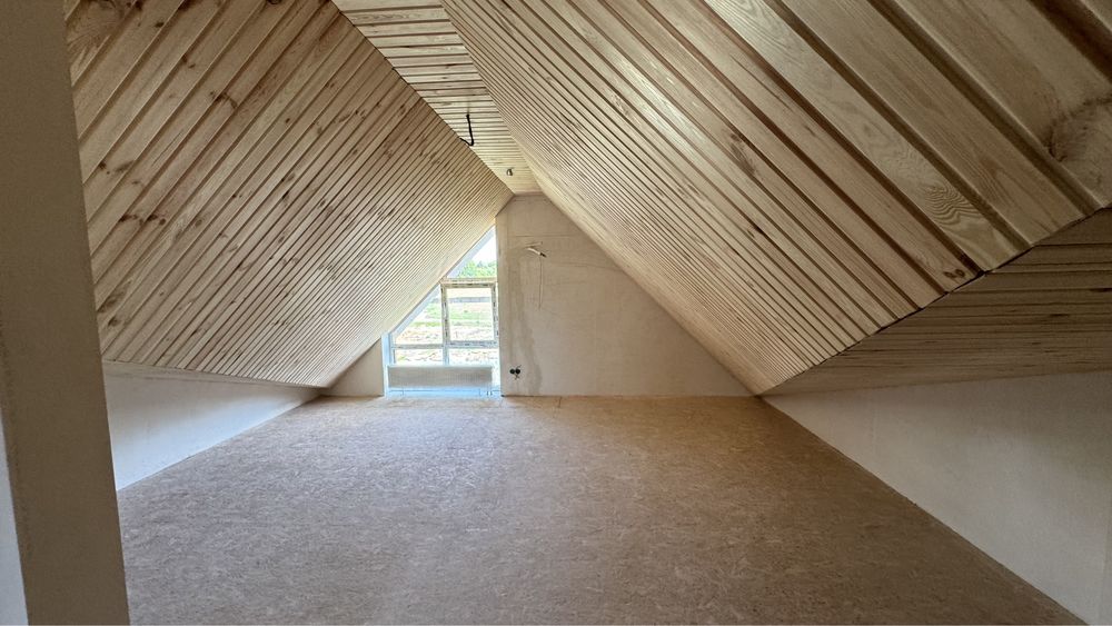 - зроблений мансардний поверх (вирівняли підлогу, покладено осб , вирівняли балки даху , зашили вагонкою , зроблені перестінки)