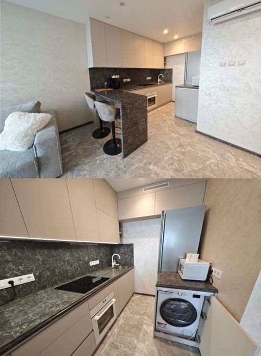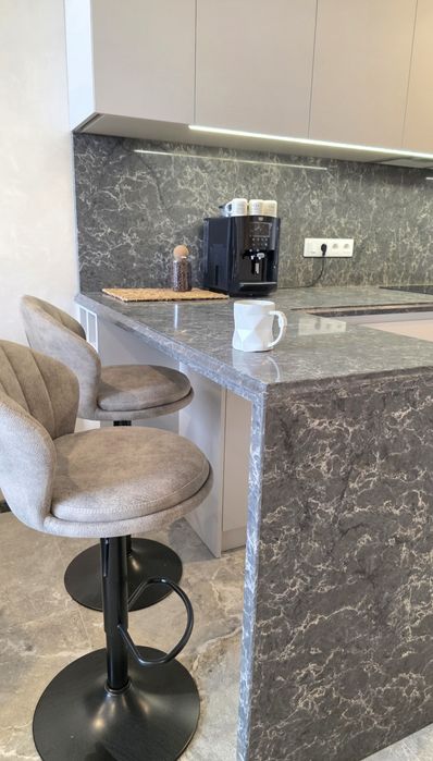 Кам’яна стільниця з барною зоною, вбудована техніка преміум-класу (холодильник, посудомийна, духова шафа, кавомашина, сушильна машина, індукційна плита, мікрохвильовка).