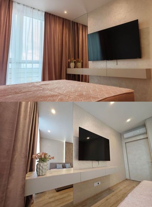 Ліжко 180×200, панно з підсвічуванням, шафа, великий телевізор 65”, будуарний куточок із дзеркалом у підлогу.